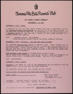 A Gamma Phi Club was organized in 1937 by Florence Bertine Watt (Arizona, 1924) to petition Gamma Phi Beta. Mrs. Watt interested the other chapters in the province* in promoting a chapter at the University of Southern California and the petition was approved. Actually the charter was granted at Convention 1938 in Del Monte, when all eight club members were initiated by members of all chapters in Province VII**.