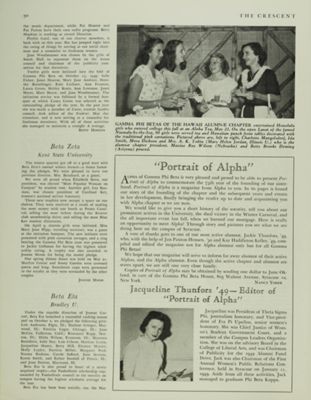 The Kent State campus was opened to National Panhellenic Conference organizations in 1947 and a local society, Theta Sigma Tau, was investigated by Ursula Smith Owen (Syracuse, 1918), director of expansion. Akron alumnae sponsored the group and installation followed in the fall. There were 29 charter members, two faculty members and seven alumnae initiated by members of Alpha Eta Chapter (Ohio Wesleyan) on October 25, 1947. The charter was presented by Grand President* Penelope Murdoch Simonson (California-Berkeley, 1909).