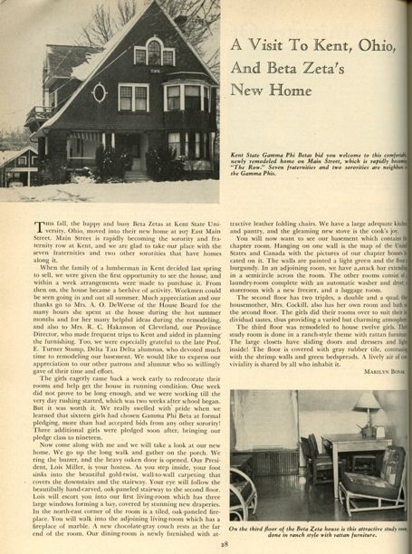 Beta Zeta Chapter was installed at Kent State University in Kent, Ohio, on October 25, 1947. Beta Zeta Chapter was closed on December 1, 1972.