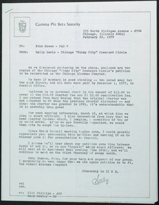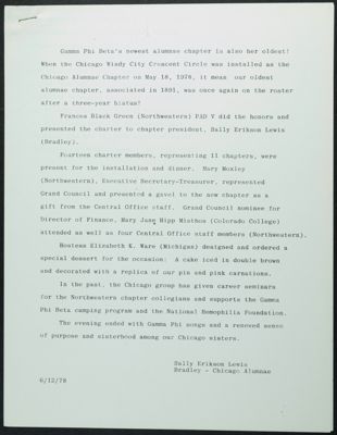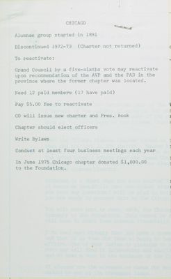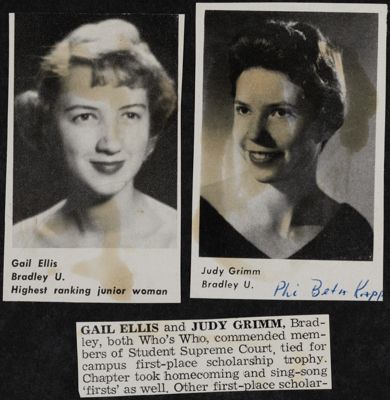 Beta Eta Chapter (Bradley) was colonized by Peoria alumnae members and 22 women became charter members. Initiation services and charter presentation took place in the Omicron Chapter (Illinois at Urbana-Champaign) facility. Four members of Grand Council* were present: Penelope Murdoch Simonson (California-Berkeley, 1909), Anna Bebb Howe (Illinois at Urbana-Champaign, 1920), Ursula Smith Owen (Syracuse, 1918) and Margaret Marr Marvin (Denver, 1924). Omicron Chapter conducted Initiation.