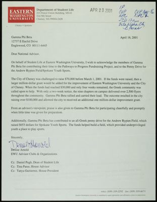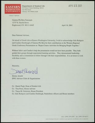 Denise Arnold to National Advisor Letter, April 18, 2001