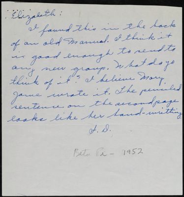 Gamma Phi Beta’s first Indiana chapter was first a local sorority organized in 1904. With the encouragement of Indiana alumnae, the group petitioned for a charter and was inspected by the Province* Director Virginia Supple Atkins (Illinois at Urbana-Champaign, 1925) and Chairman of Expansion Anita Bertran Curtis (Vanderbilt, 1932). The group was colonized on April 5, 1952 and 39 collegiate members and 53 alumnae were initiated at St. Stephens Episcopal Church by the members of Omicron Chapter (Illinois at Urbana-Champaign). The charter was presented that evening by Grand President** Evelyn Gooding Dippell (Illinois at Urbana-Champaign, 1933).